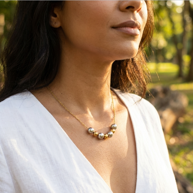 O Colar Eriú é a tradução da sofisticação contemporânea para o uso diário. Com um design delicado e minimalista, ele apresenta sete bolinhas intercaladas nos tons dourado e prateado, criando um efeito bicolor que facilita a transição entre diferentes estilos de acessórios. É a peça ideal para quem busca versatilidade, permitindo harmonizar com facilidade outros itens do seu porta-joias, garantindo um toque de elegância tanto em ambientes formais quanto em produções casuais.