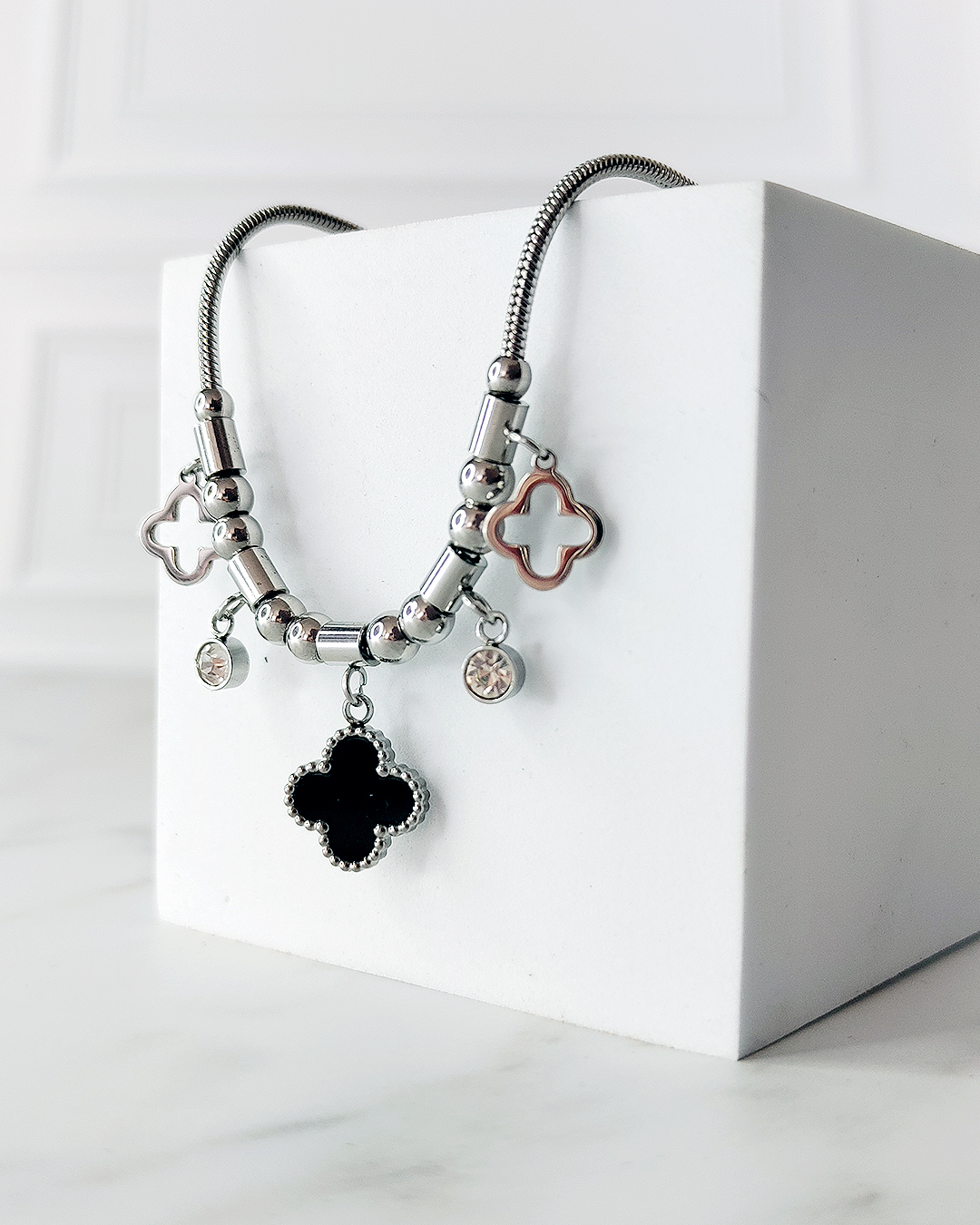 O pingente de trevo apresenta um design exclusivo: uma face em preto profundo e detalhes vazados, criando um contraste moderno que transita facilmente entre o look de trabalho e a produção para a noite.