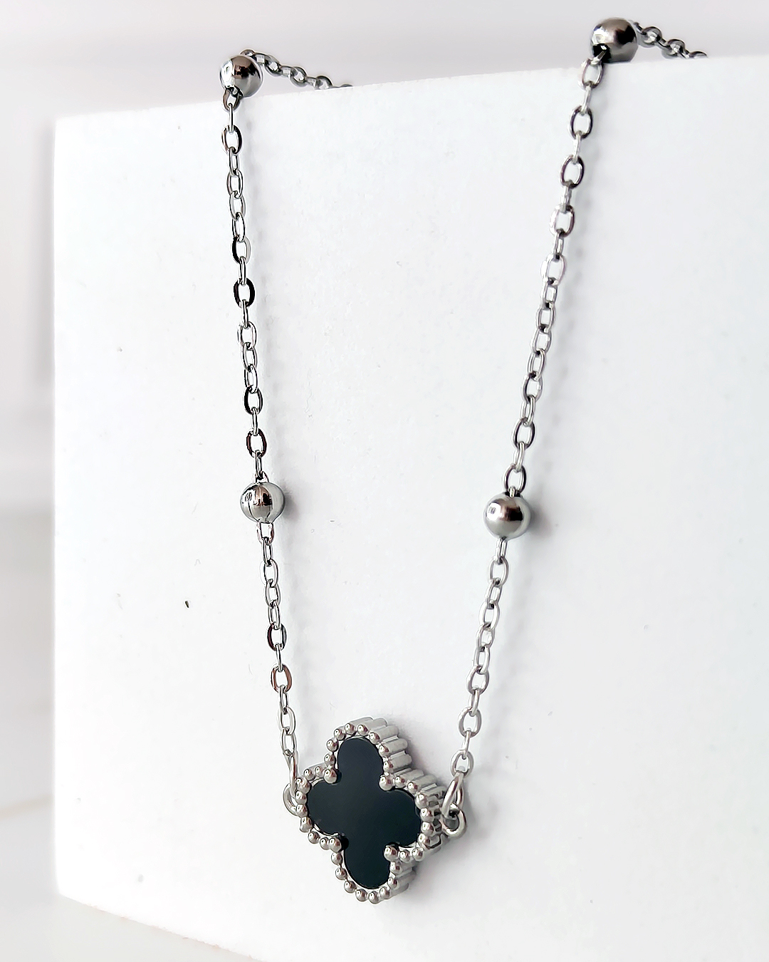 O Colar Fortuna Trevo Preto em Micro Elo Português Noxie é a tradução da delicadeza e do simbolismo. Com uma corrente refinada de micro elos e detalhes de trevo resinado intercalados com esferas polidas, esta peça traz um ar romântico e moderno para o seu visual.