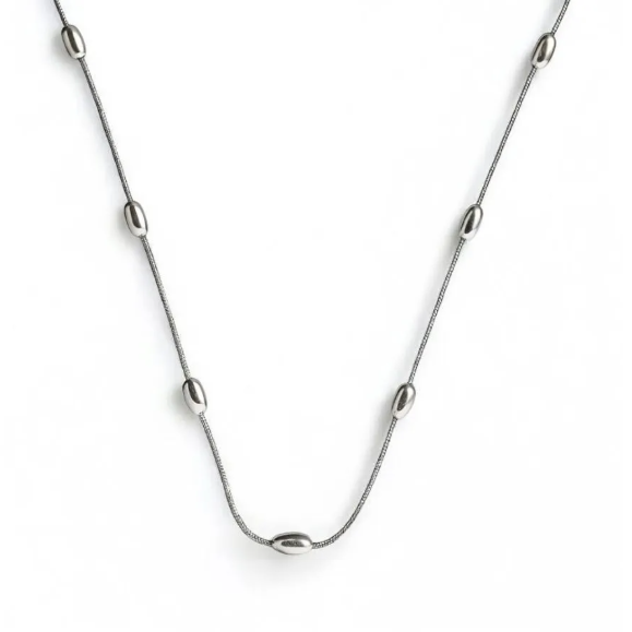 O Colar Nêmesis Noxie é uma peça de design arrojado que combina a sofisticação da malha serpente — conhecida por seu brilho espelhado e caimento impecável — com o ritmo visual das bolinhas ovais intercaladas.