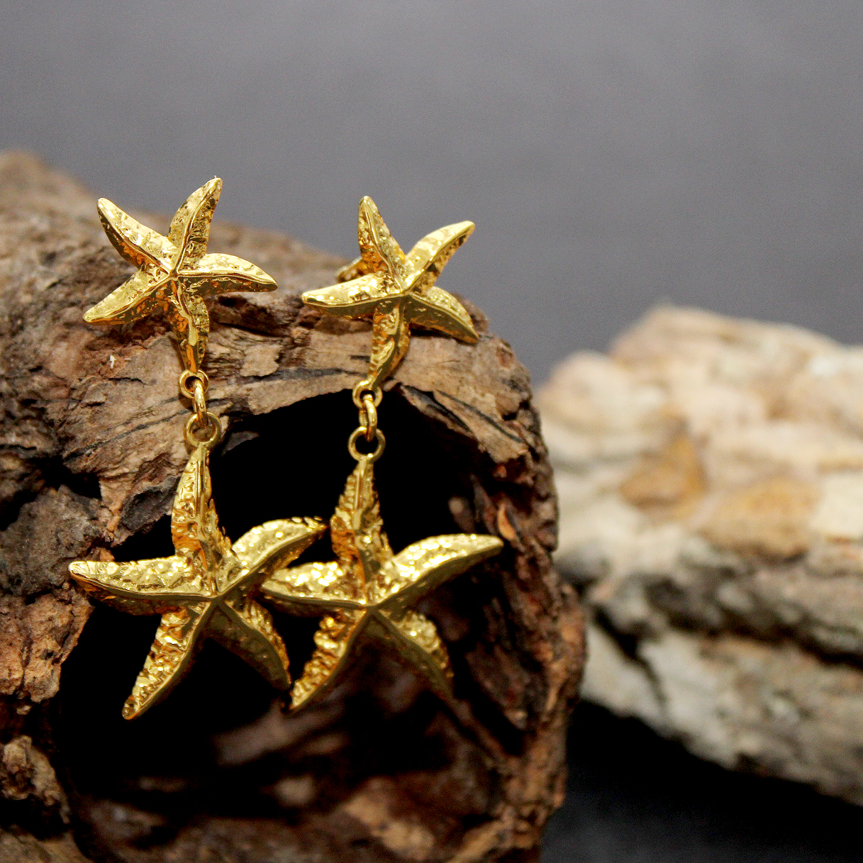 Composto por duas estrelas do mar de design orgânico e acabamento dourado intenso, esta peça traz o frescor do estilo "beach jewelry" para um patamar de luxo e autoridade. É o acessório perfeito para iluminar o rosto em produções de verão, eventos ao ar livre ou para adicionar um ponto de interesse criativo a um visual casual chic.